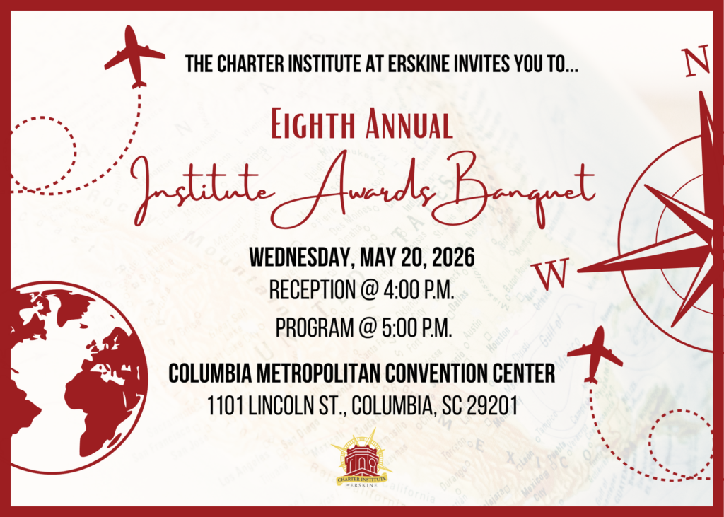 The eighth annual Charter Institute at Erskine Awards Banquet will be hosted on Wednesday, May 20, at the Columbia Metropolitan Convention Center. Students, parents, volunteers, teachers, and school leadership, along with leadership from Erskine College, will come together to celebrate academic excellence across our great state.